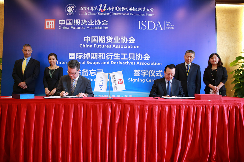 中国期货业协会和国际掉期和衍生工具协会(ISDA)12月4日在深圳签署合作谅解备忘录。中期协会长刘志超和ISDA首席执行官Scott O’Malia分别代表双方在备忘录上签字。