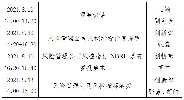 近期协会组织行业设计了风险管理公司风险控制指标体系,为了加强行业机构对风险控制指标体系的理解,顺利开展全行业的风控指标试填报及征求意见工作,引导行业机构业务健康有序发展,协会将于8月10日和13日面向全行业举办协会风险管理公司风险控制指标体系讲解直播培训。具体工作方案如下。