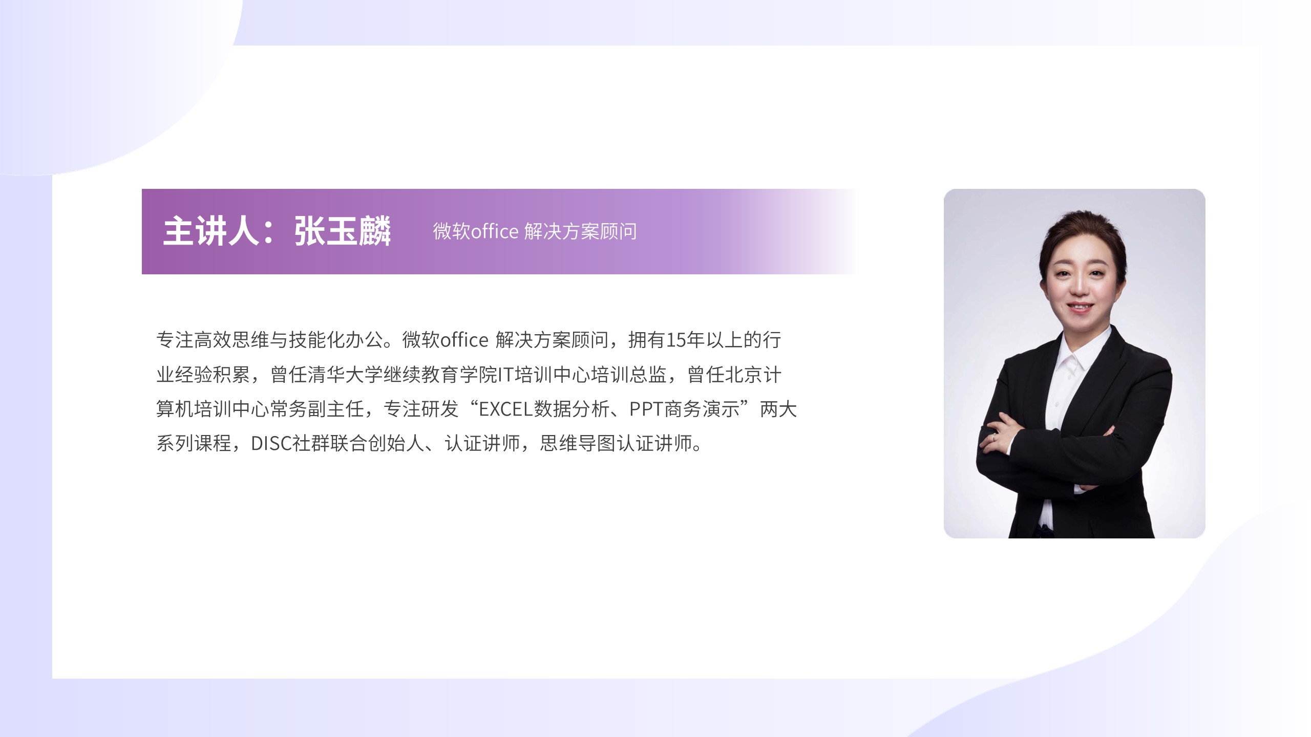 系列网络课程由张玉麟讲师制作,张玉麟老师是微软office 解决方案顾问,拥有15年以上的行业经验积累,曾任清华大学继续教育学院IT培训中心培训总监 ,专注研发“EXCEL数据分析、PPT商务演示”两大系列课程,并且是DISC社群联合创始人以及思维导图认证讲师。
