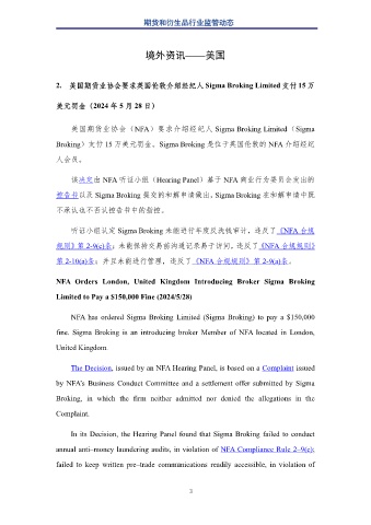 2. 美国期货业协会要求英国伦敦介绍经纪人 Sigma Broking Limited 支付 15 万