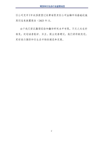 期货和衍生品行业监管动态 任公司发布《中央国债登记结算有限责任公司金融市场基础设施 原则信息披露报告(2023 年)》。 由于我们资讯整理经验和翻译研究水平有限,不足之处在所 难免,欢迎读者批评、斧正,提出完善建议,我们将积极改进, 更好助力期货和衍生品市场的建设和发展。 2