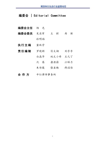 期货和衍生品行业监管动态 编委会 | Editorial Committee 编委会主任 杨 光 编委会委员 吴亚军 王 颖 冉 丽 孙明福 执 行 主 编 董秋学 责 任 编 辑 罗晓颖 符文翔 刘亭亭 白晶华 祝文小希 王凡丁 沈 茜 唐源蔚 汪琳力 朱诗薇 张亚楠 韩羽佳 合 作 方 中衍律师事务所 3