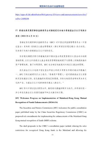 17. 香港证券及期货事务监察委员会对推进优化内地与香港基金互认计划表示