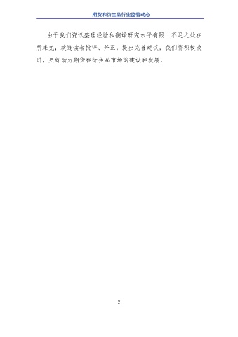 期货和衍生品行业监管动态 由于我们资讯整理经验和翻译研究水平有限,不足之处在 所难免,欢迎读者批评、斧正,提出完善建议,我们将积极改 进,更好助力期货和衍生品市场的建设和发展。 2