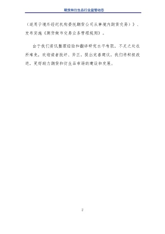 期货和衍生品行业监管动态 (适用于境外经纪机构委托期货公司从事境内期货交易)》、 发布实施《期货做市交易业务管理规则》。 由于我们资讯整理经验和翻译研究水平有限,不足之处在 所难免,欢迎读者批评、斧正,提出完善建议,我们将积极改 进,更好助力期货和衍生品市场的建设和发展。 2