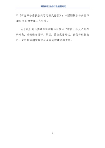 期货和衍生品行业监管动态 布《衍生品估值报告内容与格式指引》;中国期货业协会发布 2025 年自律管理工作报告。 由于我们资讯整理经验和翻译研究水平有限,不足之处在 所难免,欢迎读者批评、斧正,提出完善建议,我们将积极改 进,更好助力期货和衍生品市场的建设和发展。 2