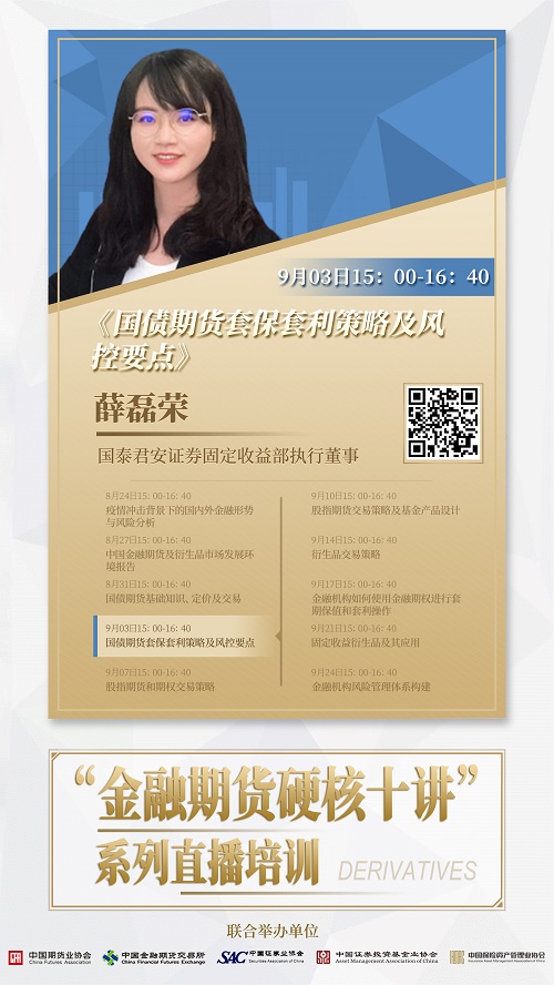 为适应金融期货业务的快速发展,满足行业对金融期货专业人才的迫切需求,中国期货业协会、中国金融期货交易所、中国证券业协会、中国证券投资基金业协会、中国保险资产管理业协会决定联合举办“金融期货硬核十讲”系列直播培训,现将第四期直播培训具体事项通知如下: