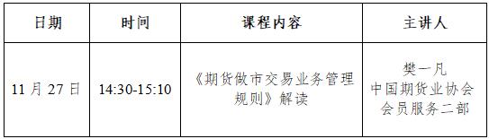《期货做市交易业务管理规则》(以下简称《做市规则》)将于12月1日起实施。为帮助期货公司及风险管理公司相关人员更加全面准确理解《做市规则》,确保规定有效执行,协会将于11月27日举办《做市规则》解读直播培训。现将培训相关事项通知如下: