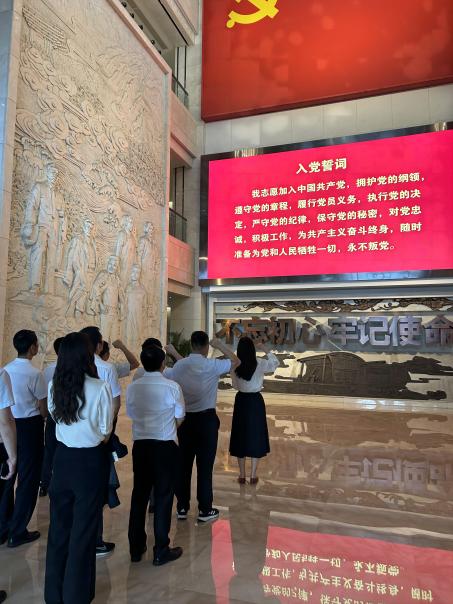 “我志愿加入中国共产党……”在教育基地一楼巨幅党旗前,全体同志庄严肃立,右拳高擎,在支部副书记吴磊的带领下再次重温入党誓词。铿锵誓言回荡大厅,提醒每名党员不忘来时路、永怀为民心。