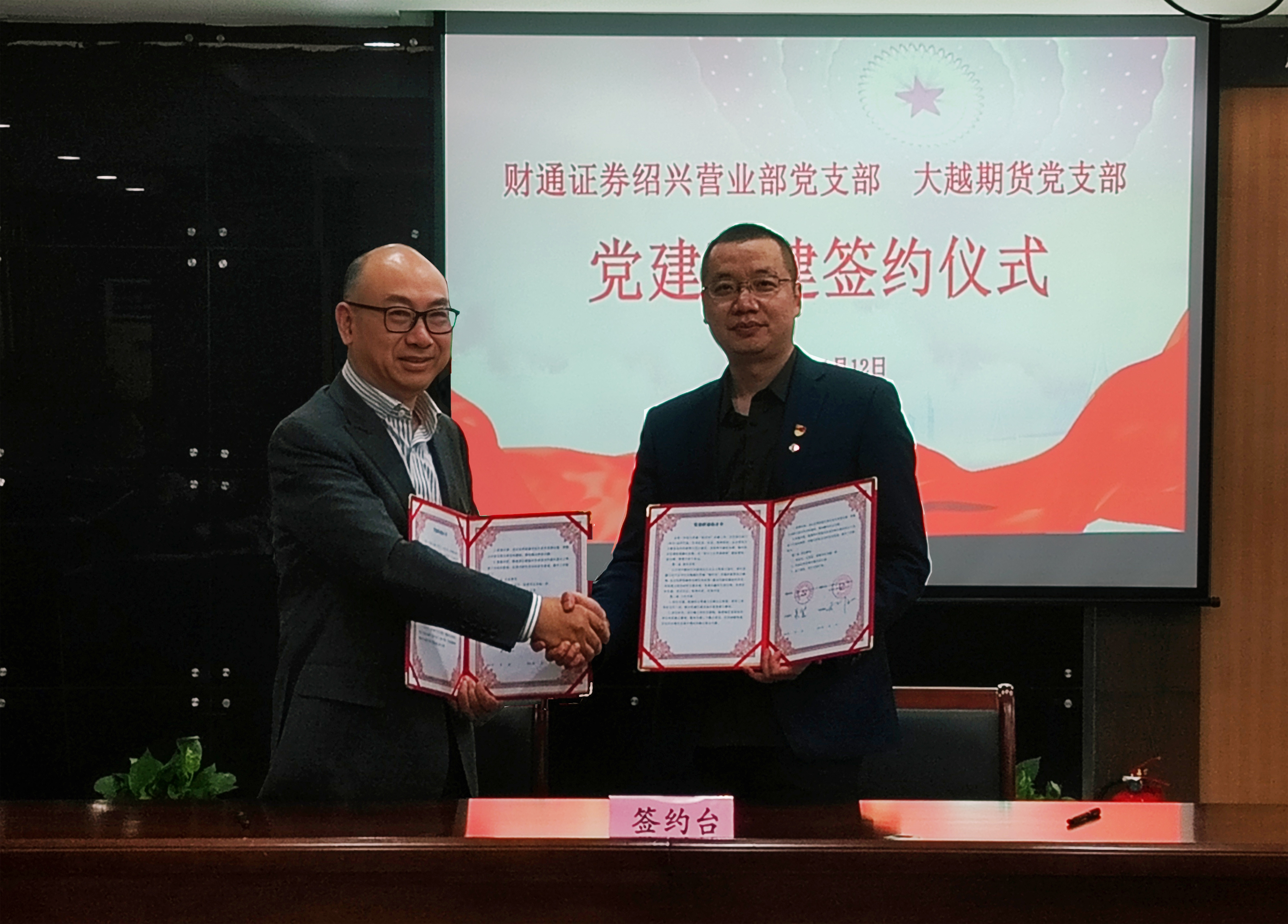 在与会党员的共同见证下,大越期货党支部与财通证券绍兴营业部党支部举行了党建联建协议签约仪式。党建联建协议的签约,标志着两家党支部正式建立起常态化、制度化的党建联建合作关系。