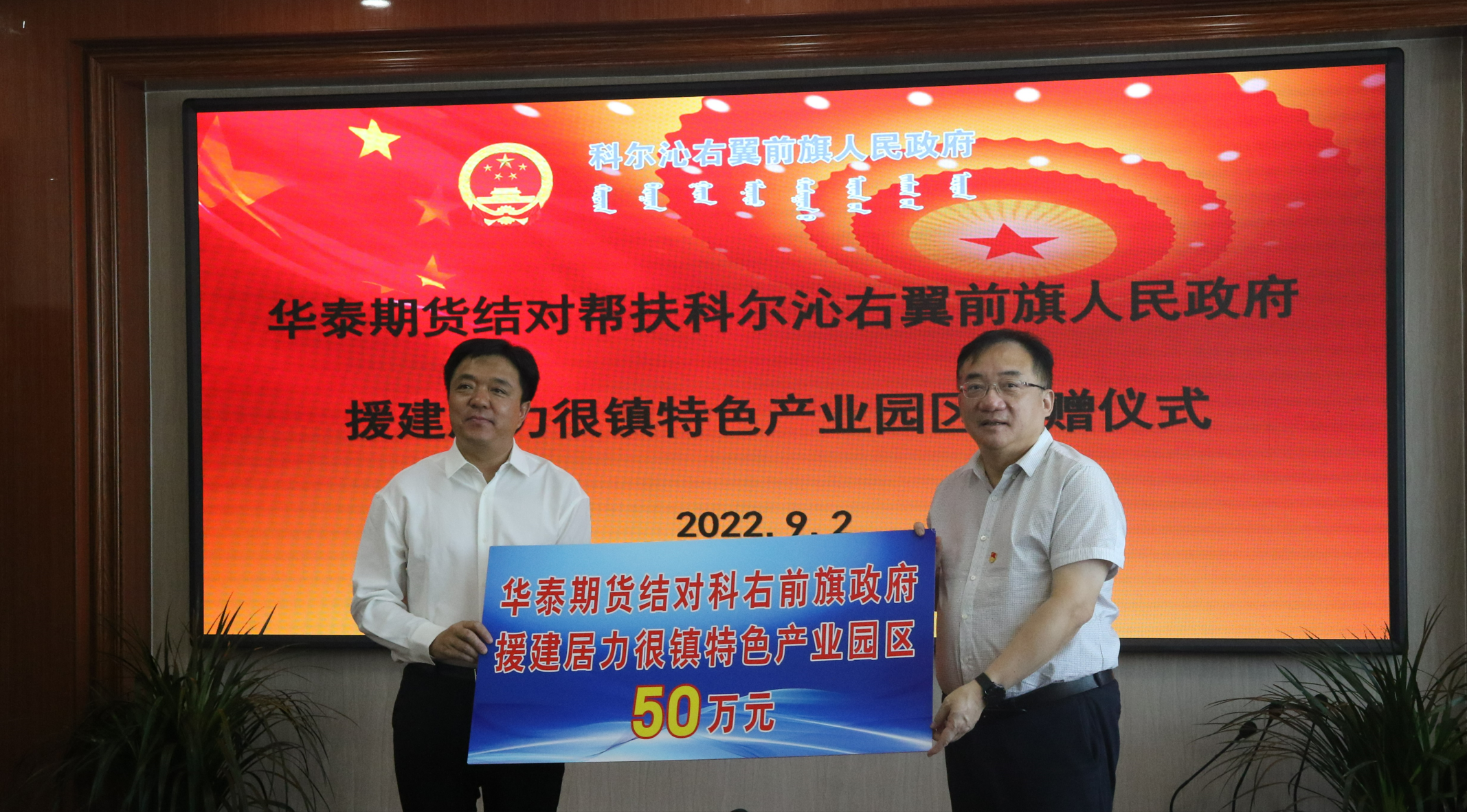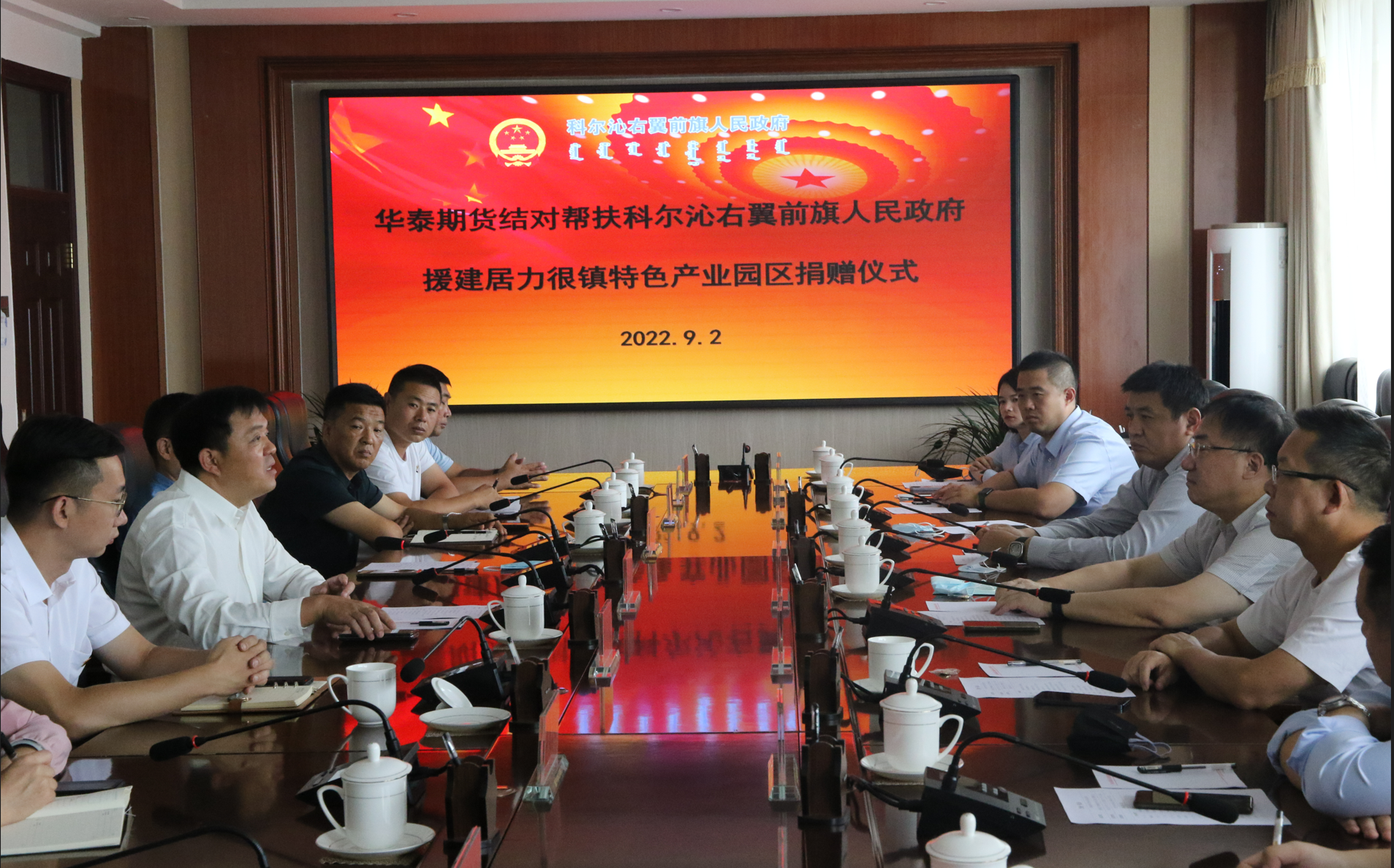 9月2日,华泰期货结对帮扶科右前旗人民政府援建居力很镇特色产业园区捐赠仪式在科右前旗举行,华泰期货党委书记、董事长胡智、高级顾问殷晓峰、行政总监许冯兵、北京分公司总经理兰晓,科右前旗人民政府副旗长刘海涛、赵洪斌等出席捐赠仪式。