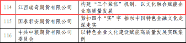 此次入选,既是对公司长期以来坚持党建引领、文化铸魂的肯定,更是对公司以文化赋能战略纵深推进的权威认可。瑞奇期货将以此为动力,持续深入践行“五要五不”实践要求,切实把文化软实力转化为推动企业高质量发展的硬支撑,为地方经济社会发展贡献更多瑞奇力量。