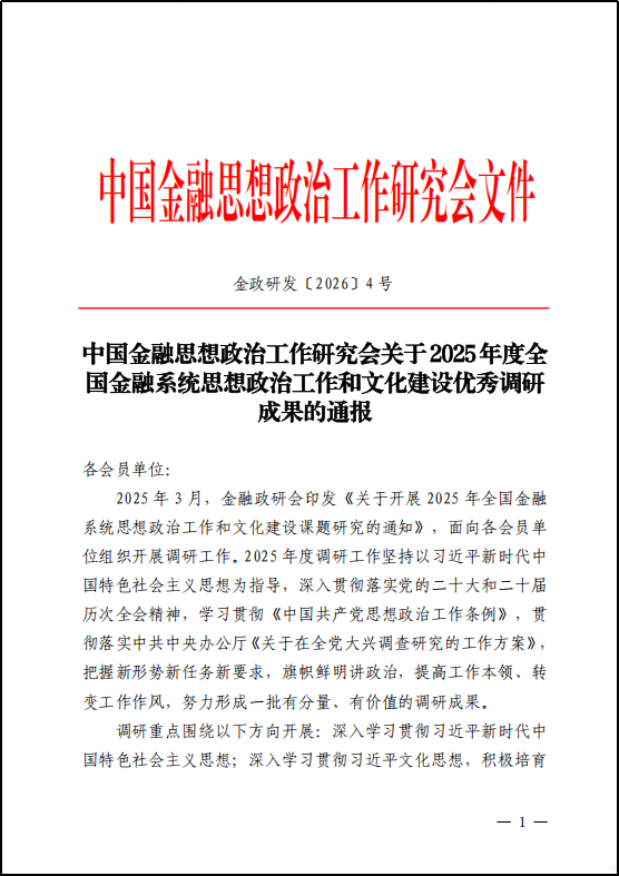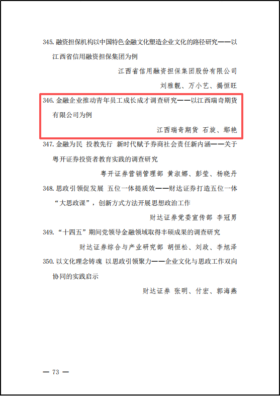 近日,中国金融思想政治工作研究会发布《关于2025年度全国金融系统思想政治工作和文化建设优秀调研成果的通报》,对优秀调研成果予以表彰。瑞奇期货调研成果《金融企业推动青年员工成长成才调查研究——以江西瑞奇期货有限公司为例》在各金融机构推报的1813项(篇)调研成果中脱颖而出,荣获优秀奖。