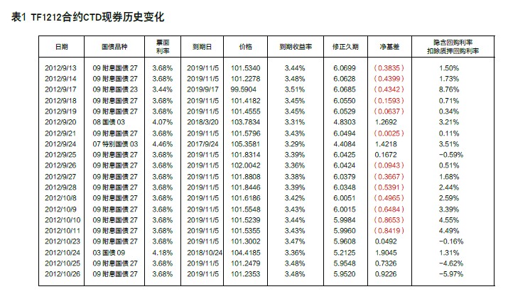 在做国债期现套利时,一般是用CTD和期货进行多空配对交易。这里呈现的是TF1212合约的历史变化情况,我们没有针对可交割债券的流动性进行筛选,假设所有的可交割现券在市场上都可以得到。