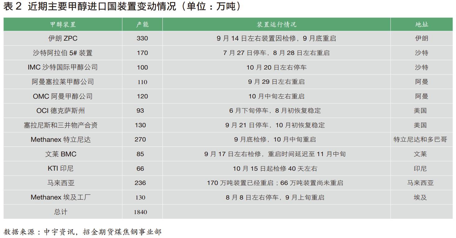 中宇资讯的统计同时显示,7至10月份,中东、美洲、东南亚共计检修甲醇产能1840万吨(目前尚有沙特100万吨、文莱85万吨、印尼66万吨、马来西亚66万吨甲醇装置尚未重启),大型甲醇装置的接连检修是进口量环比下降的关键因素之一(表2)。