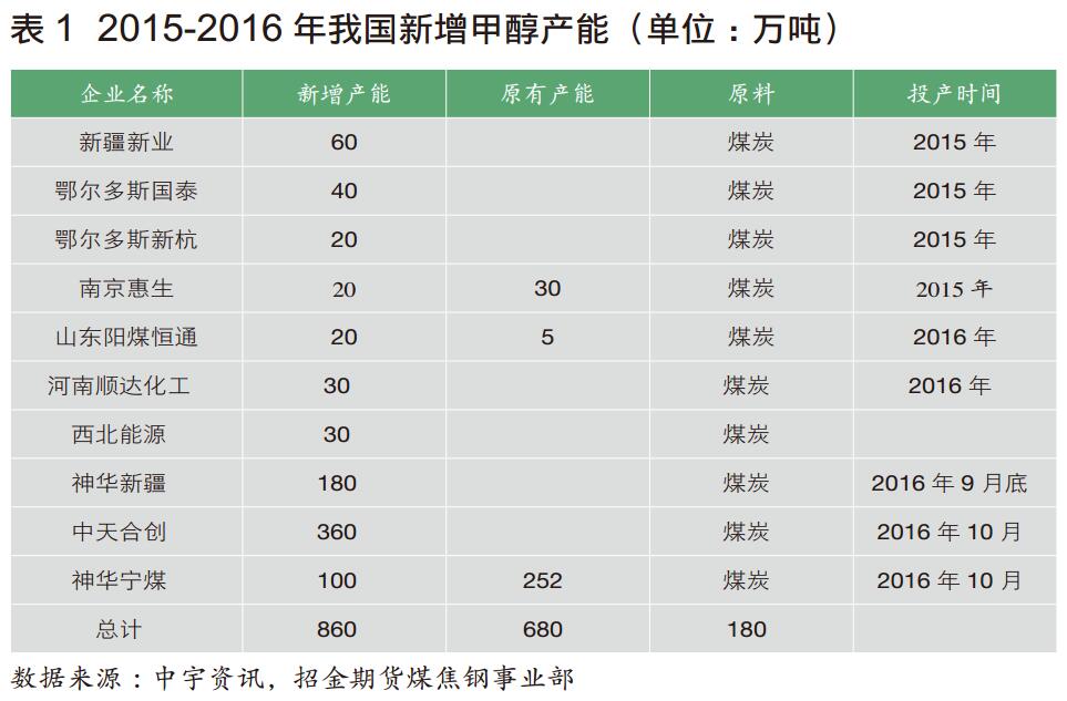 环保问题一直是今年关注的焦点问题,甲醇作为化工企业,受环保因素影响较大。据中宇资讯统计,2015至2016年甲醇新增产能860万吨,在总产能中所占比重仅为11.47%,产能增速明显减缓。其中一体化产能680万吨,占比80%左右,实际新增产能仅为180万吨,一体化装置成为主流(表1)。