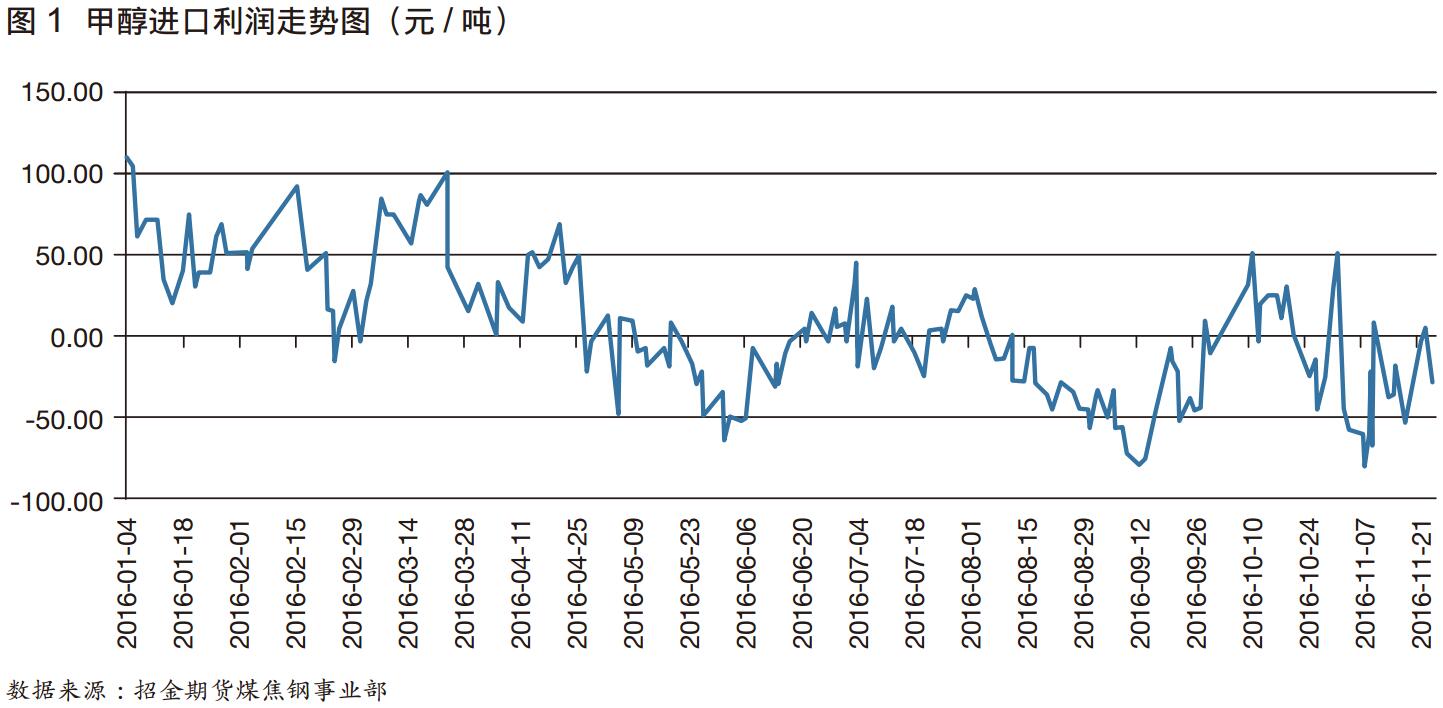 2016年数据显示,进口利润在2至3月份出现最大值,进口数量在5至6月份出现最大值(92.66万吨与90.13万吨);随后,进口利润在4月份开始下降,进口数量相应在7月份出现环比减少趋势。而进口利润从5月份开始基本倒挂,对应进口数量在8月份开始环比大幅减少。数据显示,5至9月份进口利润基本保持倒挂,8至10月份甲醇进口量已经出现环比减少趋势,按以上规律预测,11至12月份甲醇进口数量环比减少趋势或将延续,这将对甲醇价格形成有力支撑(图1)。