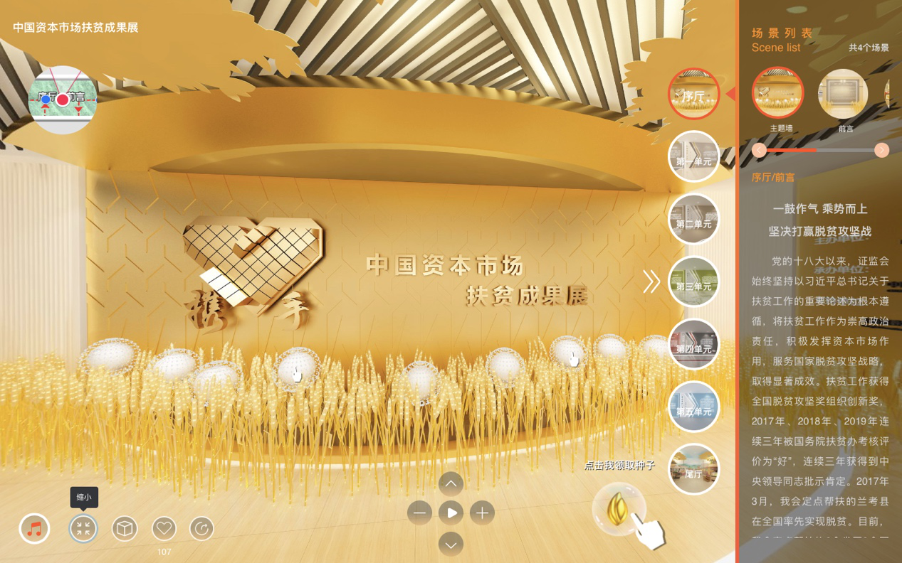 过去的2020年是脱贫攻坚收官之年,也是中国全面建设小康社会宏伟目标的实现之年。为集中展示中国资本市场在扶贫历程中发挥的作用和取得的成果,由中国证监会扶贫办主办,中国证券博物馆承办,上海证券期货文化基金会资助的“携手——中国资本市场扶贫成果展”于2021年1月23日在中国证券博物馆官网正式上线。该展览汇集了中国证监会会管系统45家单位选送的近600张图片图表、40余个扶贫视频及30余个扶贫县扶贫项目航拍素材,以三维数字网络展厅形式进行线上展示。通过3D建模和720全景技术等数字软件和互联网新技术,搭建三层约1830㎡的网上虚拟展厅。观众点击链接即可虚拟漫游,观看海量图文影音资料。