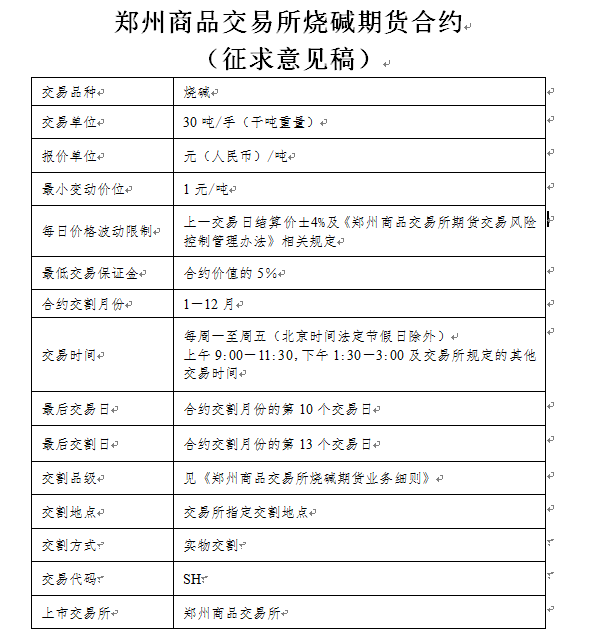 据郑州商品交易所8月4日消息,根据《中华人民共和国期货和衍生品法》《期货交易管理条例》《期货交易所管理办法》等有关法律、法规和规章,现将郑州商品交易所烧碱期货合约(征求意见稿)、《郑州商品交易所烧碱期货业务细则(征求意见稿)》和郑州商品交易所烧碱期权合约(征求意见稿)予以公布。