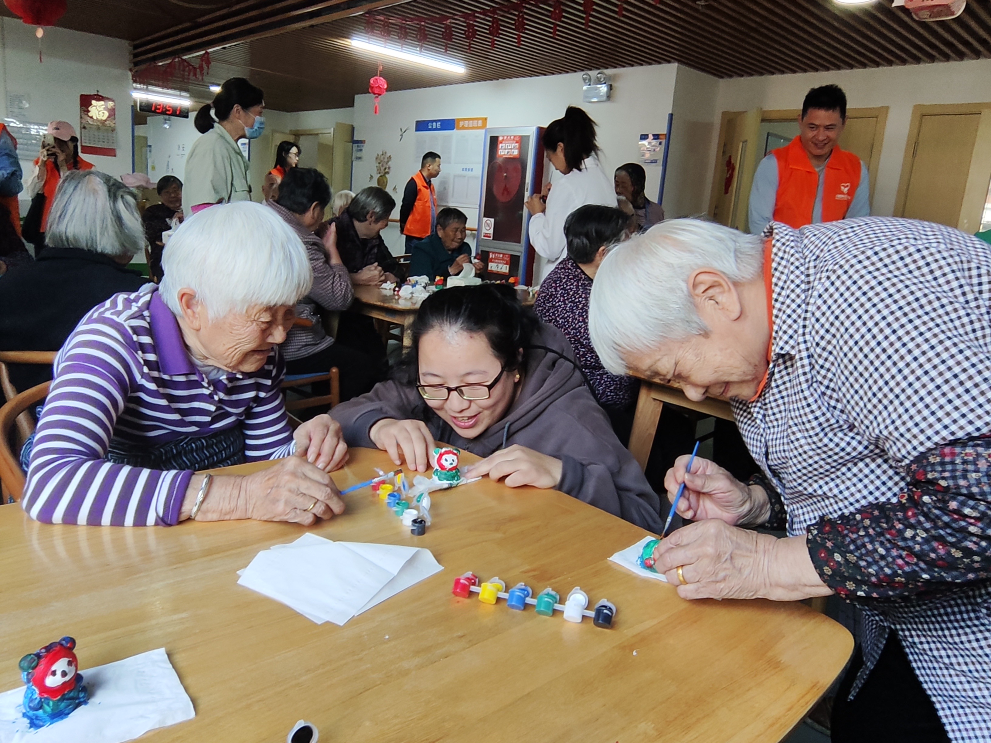 首先开展的是手工娃娃作画活动,他们手捧色彩斑斓的瓷娃娃,认真地构思着每一笔,这些瓷娃娃最终将化身为一个个生动有趣的小精灵,陪伴着每一位老人。