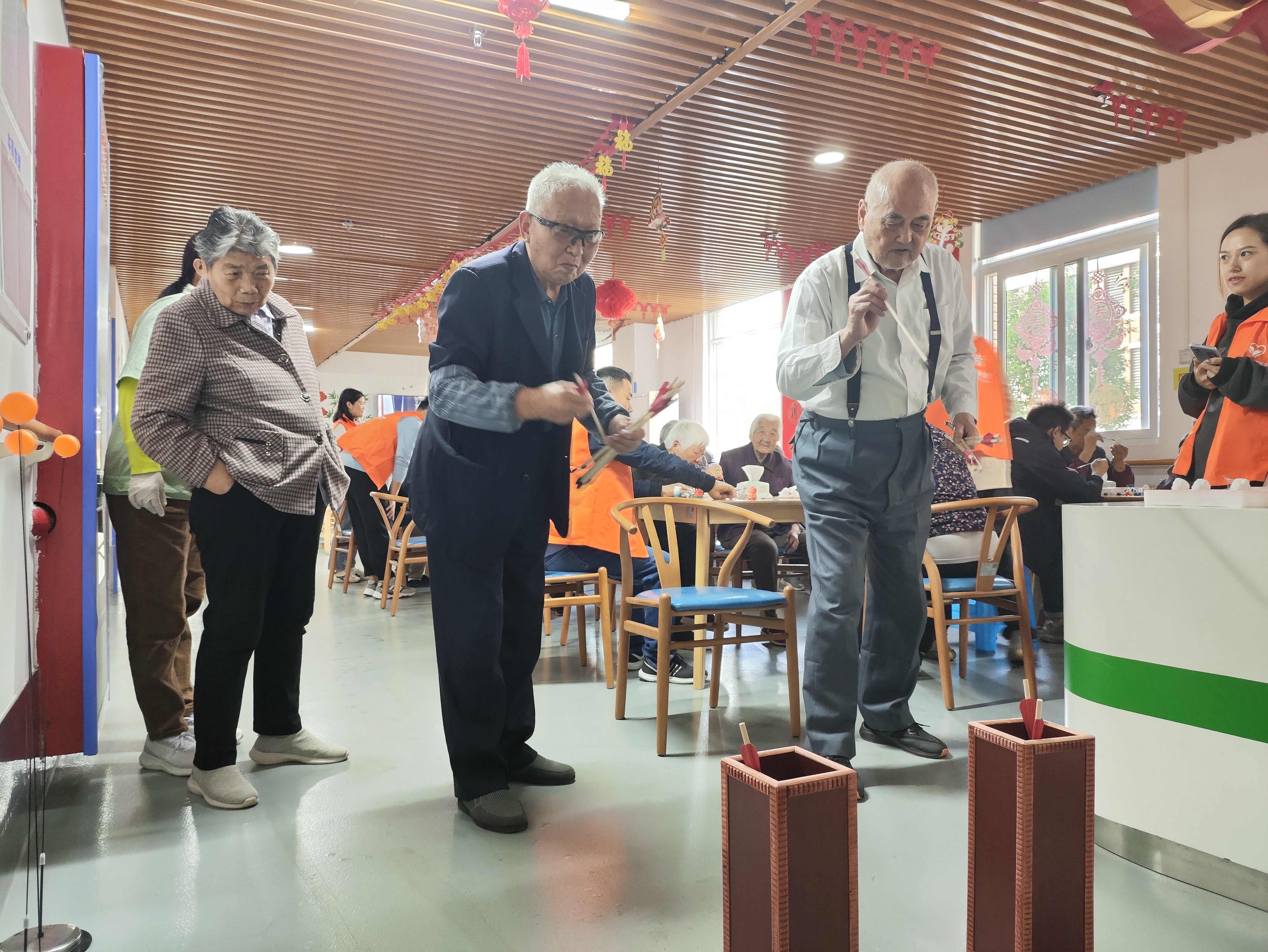 与此同时,另一边的投壶和打乒乓球活动也正如火如荼地进行着。投壶是古代文人雅士喜爱的一种游戏,随着现代科技的进步,这种古老的游戏似乎已经淡出了人们的视线。但在此次活动中,志愿者们重拾这一传统游戏,与老人们一起在欢笑中度过难忘的时光。乒乓球是我国的国球,打乒乓球不仅可以锻炼人的反应能力,还能增进身心健康。在乒乓球比赛中,老人们精神焕发,兴致勃勃地参与到这项运动中。
