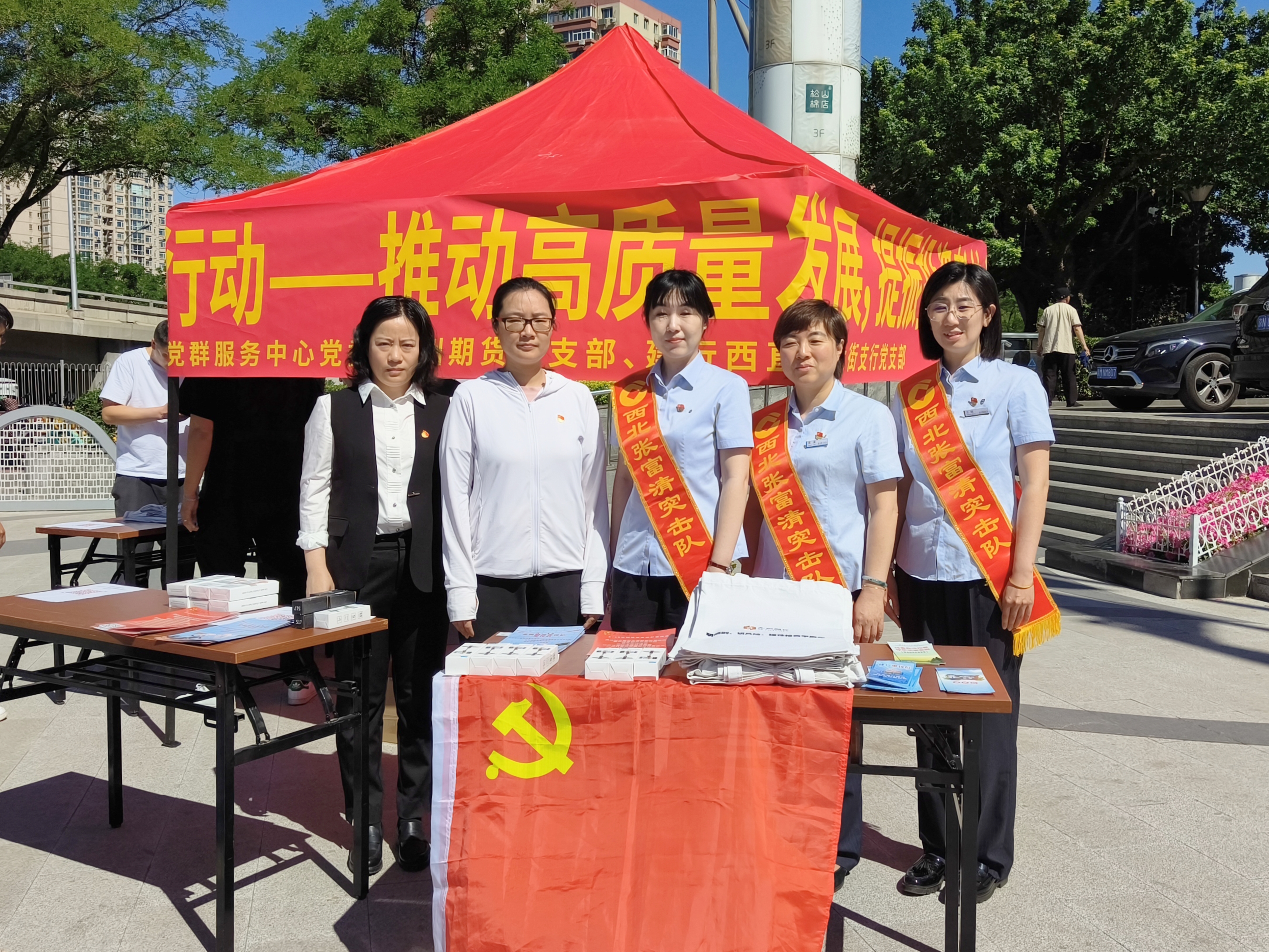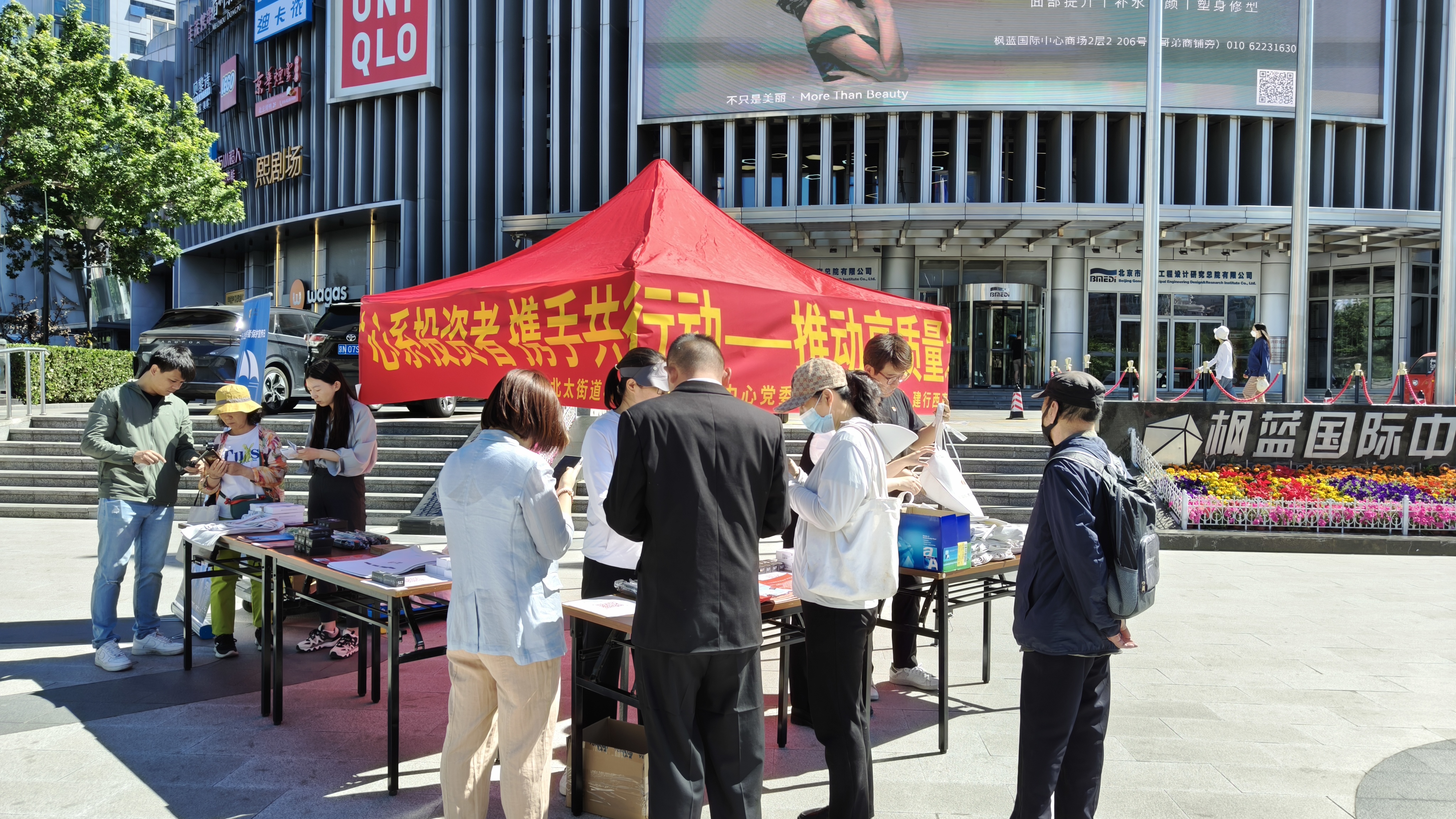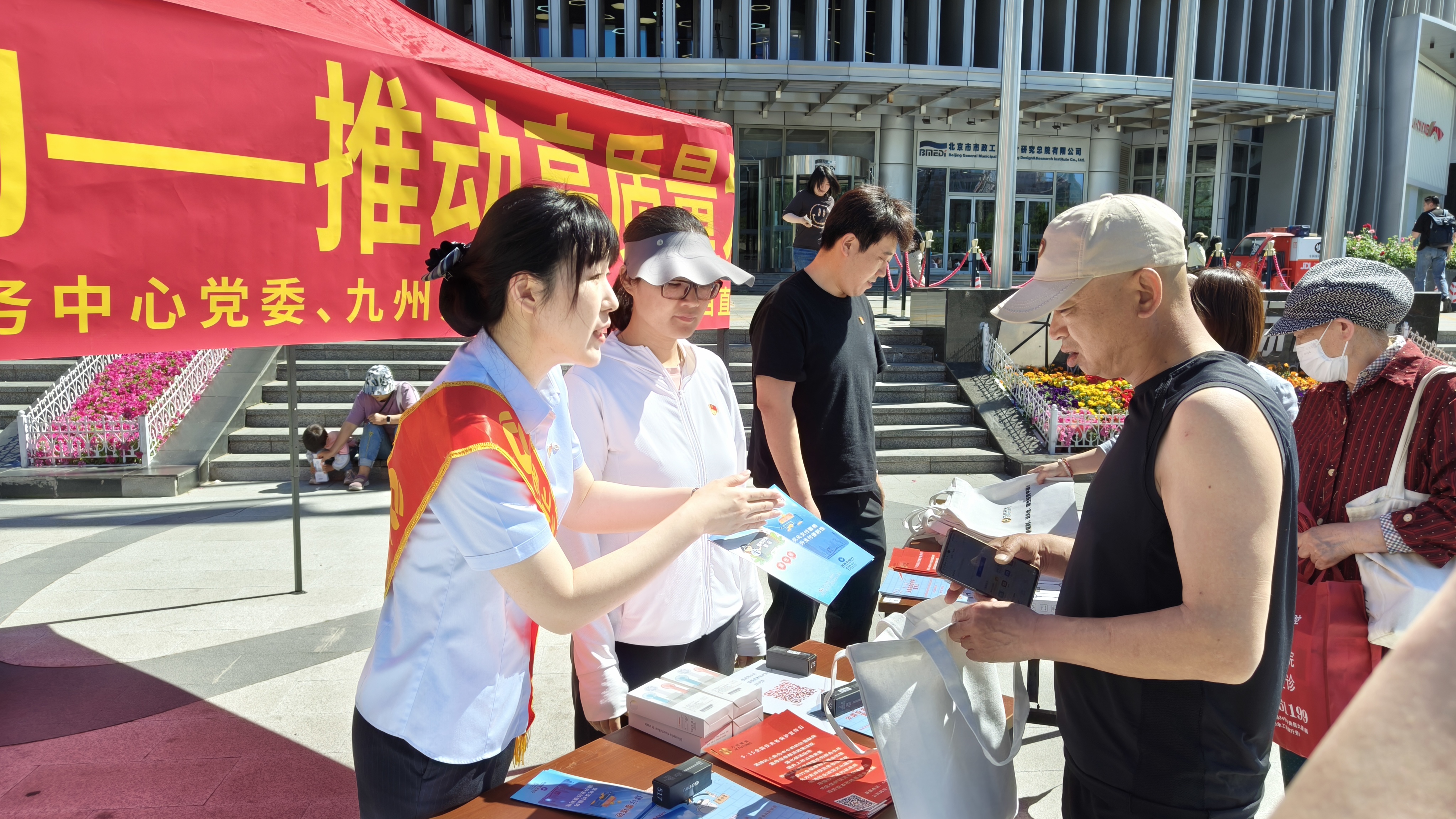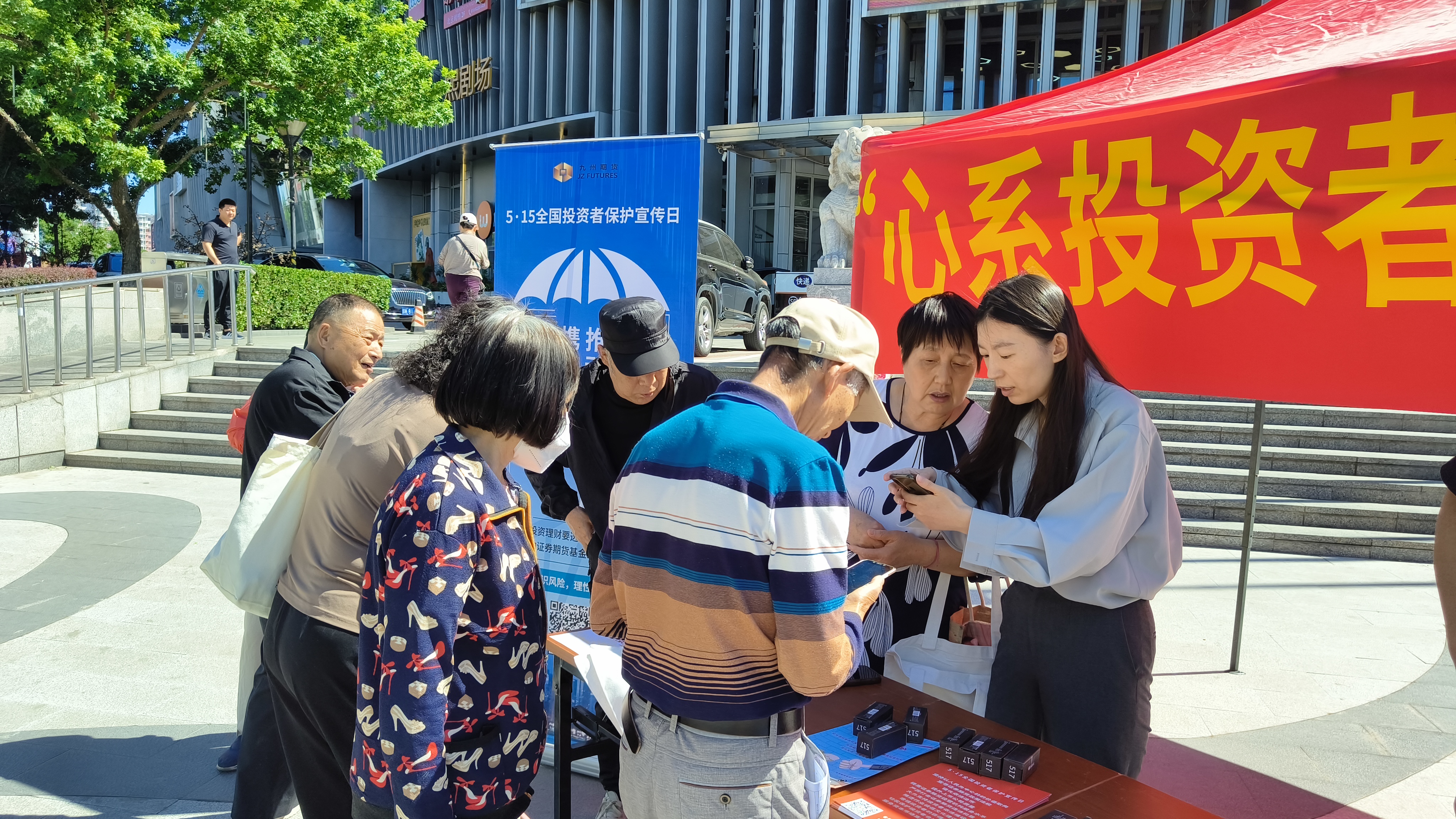 2024年5月15日上午,九州期货有限公司党支部联合了北太庄街道枫蓝党群服务中心党委和建行西直门北大街支行党支部共同在枫蓝国际购物中心广场,开展以“心系投资者,携手共行动--推动高质量发展,提振投资者信心”为主题的宣传活动。