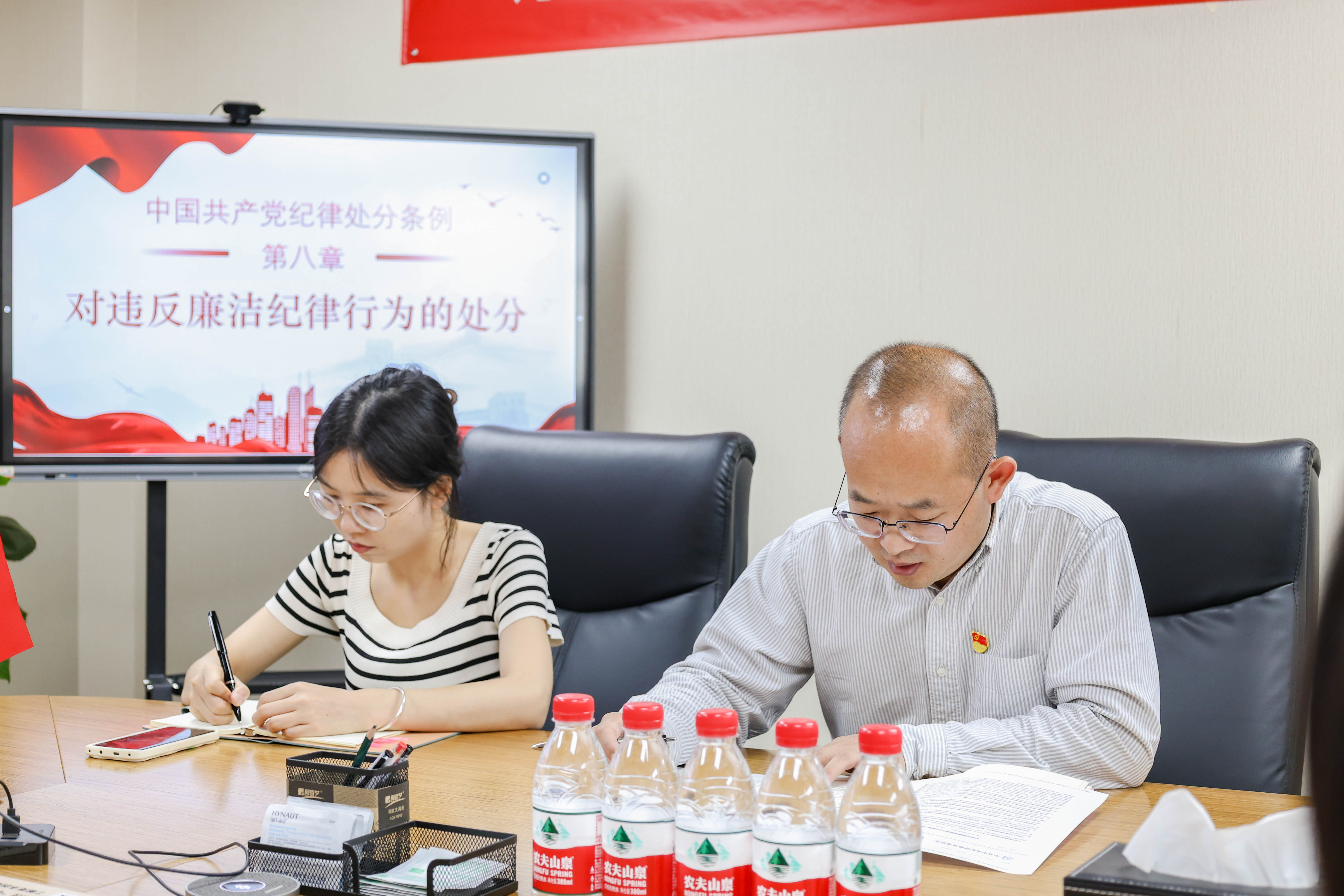 随后,纪检委员、首席风险官赵宏杰同志带领大家集中学习《中国共产党纪律处分条例》第八章“对违反廉洁纪律行为的处分”,并重申了《华源期货2024年端午节期间廉政监督提示》,还结合期货行业的实际情况,分析了廉洁风险点和防范措施,为大家提供了实用的廉政指南。