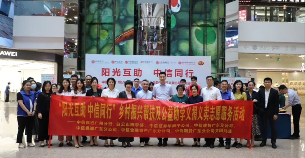 为深入贯彻落实党的二十大精神,积极履行国企责任担当,为助力乡村振兴凝聚爱心力量,6月6日,由中信银行广州分行主办的“阳光互助 中信同行”乡村振兴帮扶及公益助学义捐义卖志愿活动在广州市中天购物商场大堂举行,活动联合中信集团子公司在穗单位以及爱心企业共同参与。中信期货广东分公司党支部、团支部积极组织党员和团员青年参与志愿服务活动,以实际行动践行“我为群众办实事”。