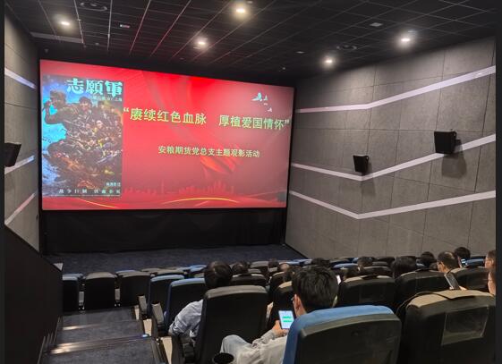 为庆祝中华人民共和国成立75周年,深入学习贯彻党的二十届三中全会精神,传承红色基因,进一步增强党员的责任感和使命感,10月18日,安粮期货党总支组织开展“赓续红色血脉 厚植爱国情怀”主题观影活动,在合肥的党员集体观看了爱国题材影片《志愿军:存亡之战》。